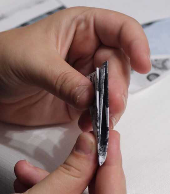 Dobla el papel por la mitad, que por la mitad otra vez, como se muestra. El último doblez puede ser complicado. Doblar en la esquina, para que todos los pliegues son por un lado, y el corte de los bordes en el otro. Usted debe terminar con un triángulo, como la última imagen. Por conveniencia, llamaremos al lado de los bordes de corte la parte superior y el punto, la parte inferior.