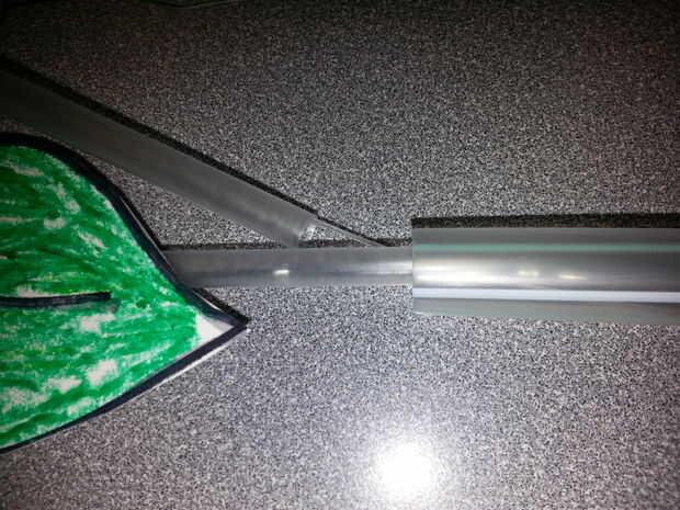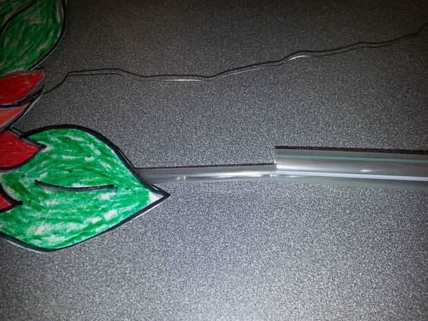 Uno de los brazos de paja puesto a través de la paja de la burbuja. La línea de nylon se sale de la parte inferior de la paja de la burbuja.