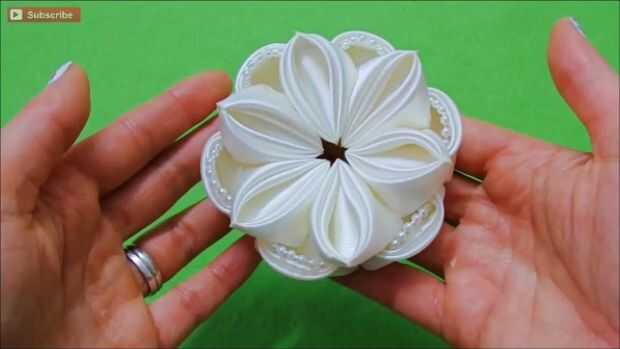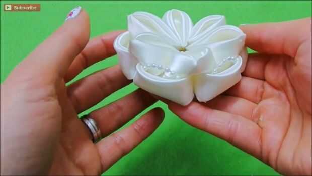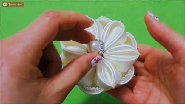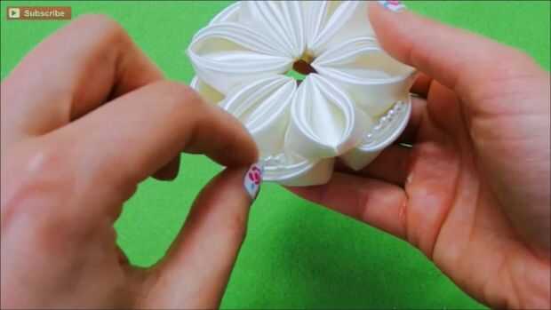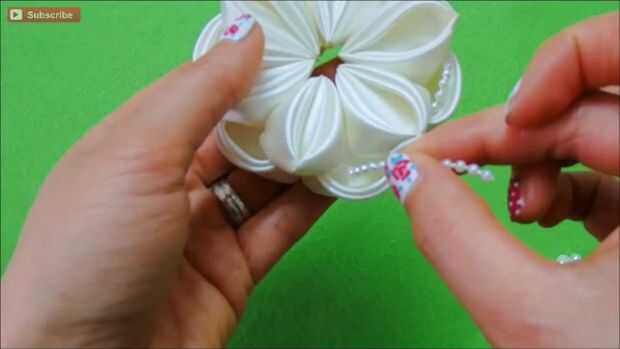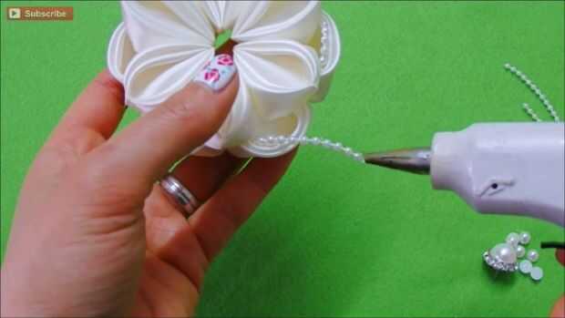 Poner pegamento caliente en los ambos extremos de la pieza de la cadena de perlas y colocar en el interior de las esquinas de los pétalos de la primera capa como se muestra. Añadir todas las piezas del mismo modo.