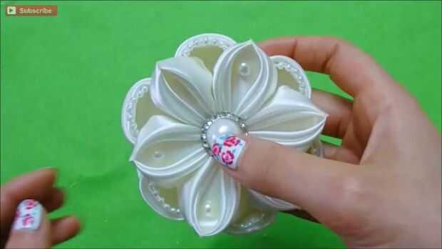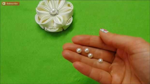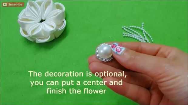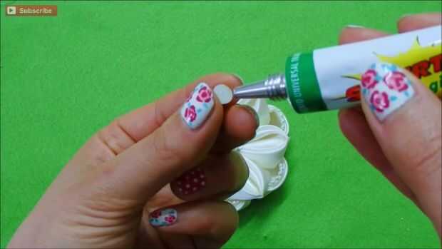 Agregar el pegamento en la parte trasera de la perla y colocarlo sobre el pétalo como se muestra en la imagen. Colocar las perlas en todos los pétalos de la capa superior.