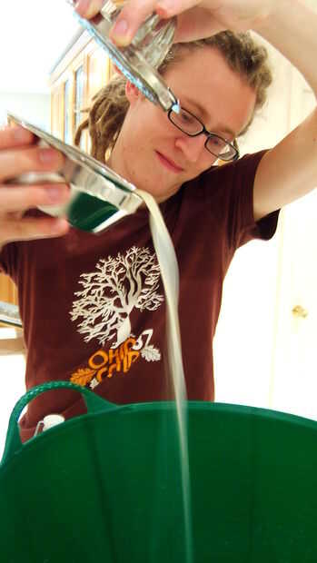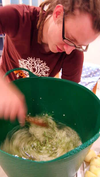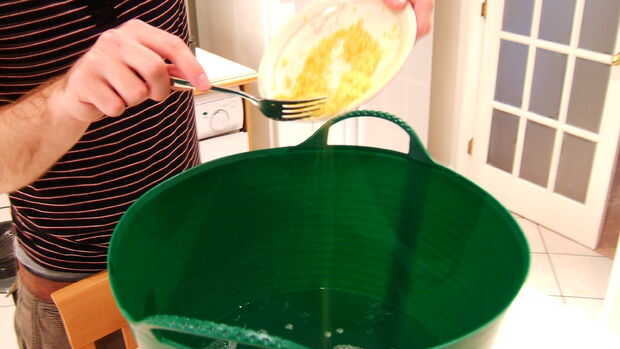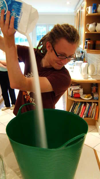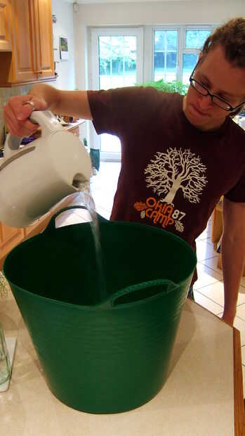 -Añadir 2 litros de agua fría para enfriar la poción un poco así que no se mata a la levadura natural de la flor - tirada en el cubo!