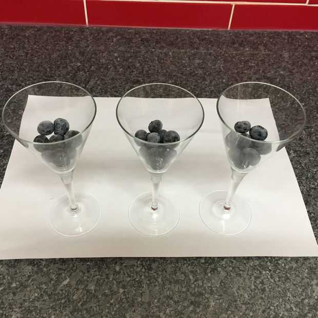 Poner algunas bayas en la parte inferior de 3 vasos bastante. Agregue la mezcla de gelatina para cubrir. Dejar en la nevera para establecer (manteniendo el resto de la gelatina a temperatura ambiente). Cuando set, rellenar las copas con el resto de la mezcla de gelatina. Poner en el refrigerador para establecer.