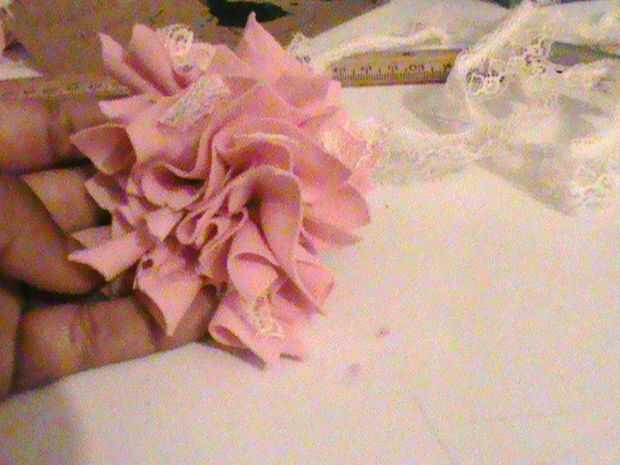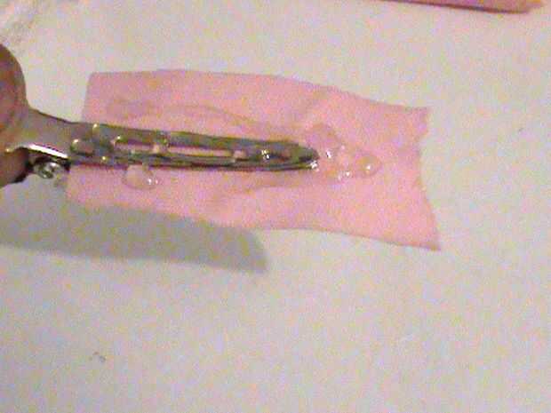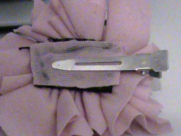 Cortó la cinta de encaje en trozos del cerca de 1 cm. Tomar tu flor y pegamento caliente los bits dondequiera que usted tiene gusto. El azar más mejor. Entonces realizará un pelo clip un trozo de tela (del mismo tamaño que la base) entre la pinza y pegamento caliente la parte superior. Y colóquelo en la base de la flor. Y entonces todo listo!!!!!!