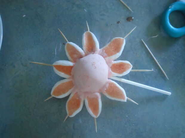 Marque un palillo de dientes en el lado del agujero del donut, pegar el extremo de los pétalos de la flor en el amarillo se funde, luego pegarlo en el lugar con el palillo sosteniéndolo.  Repita hasta que tenga pétalos de malvavisco todo el camino alrededor del agujero del donut.  Que la flor pastel pop resto imperturbado de espaldas hasta que cuaje.  Retire los palillos.