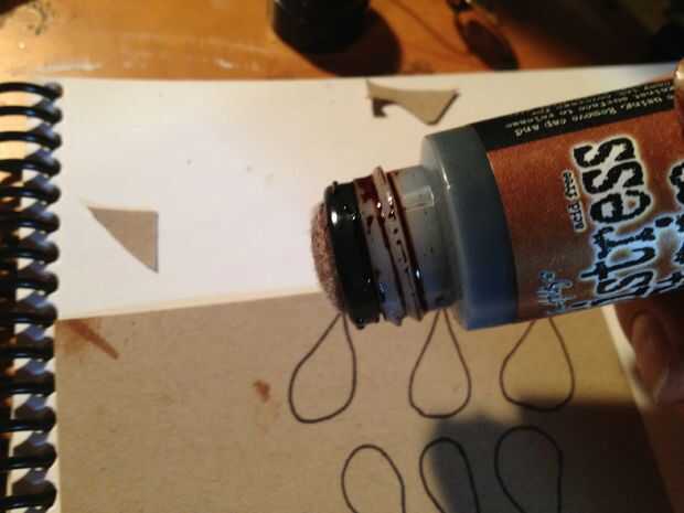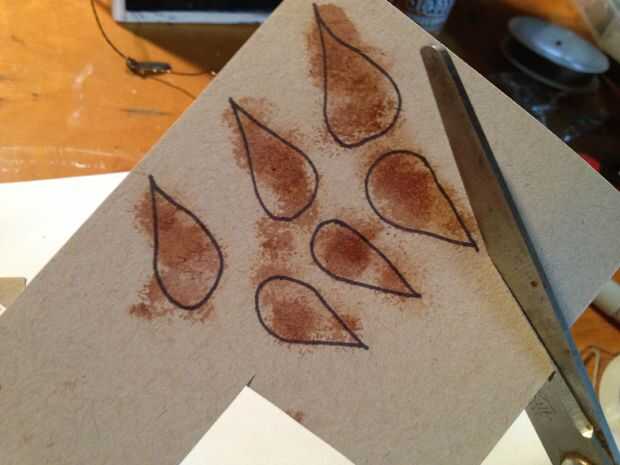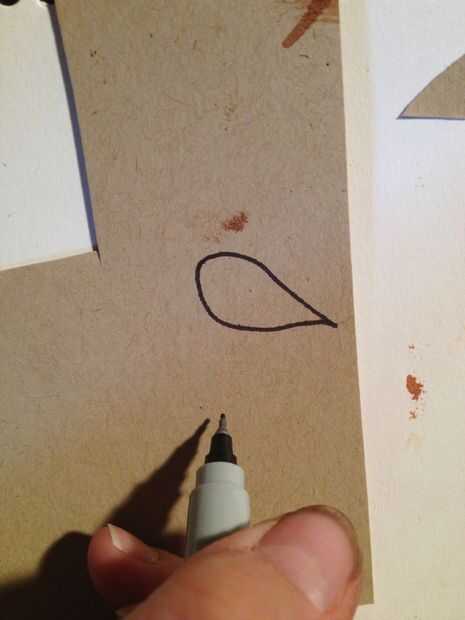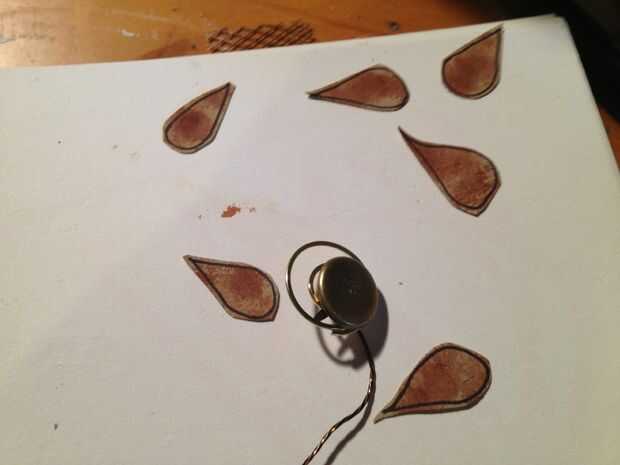 Comenzar a dibujar formas de pétalos en la cartulina marrón. Después de garabatos sus pétalos utilice al Tim Holtz Distresser para añadir cierta profundidad a sus pétalos.  Si no tienes acceso a este producto solo utiliza algunos sienna quemado diluido y dab en la cartulina.  Después de su hecho cortar los pétalos.  Me gusta dejar el contorno negro para los míos. No importa la pintura marrón en mis dedos y las uñas... Estaba trabajando en otro proyecto al mismo tiempo... :)