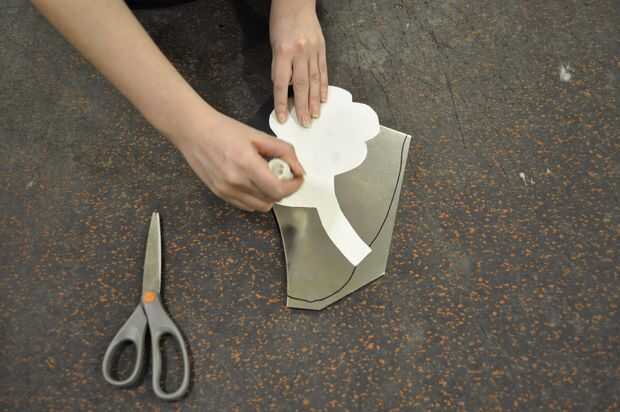 También puede utilizar la plantilla proporcionada por el personal de NextFab. Si utiliza una plantilla de papel, corte aproximadamente su forma. Deja las líneas a seguir más adelante. Utilice un palillo del pegamento para pegar la parte posterior del papel para su metal. Si utiliza una plantilla de acrílico, utilice un marcador permanente extra fino o metal Escribano para seguir los contornos y traza el diseño sobre el metal.