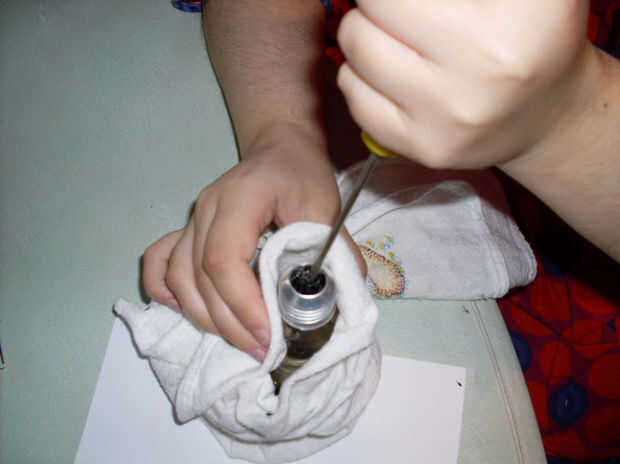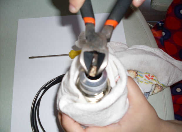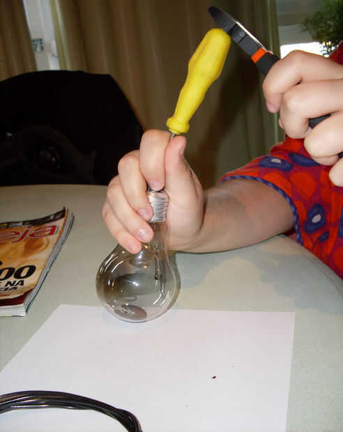 Usando el destornillador y los alicates para romper el interior de la lámpara.