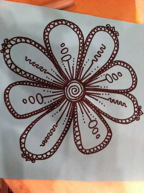 Ahora vas a dibujar una hoja en cada otro pedal. La hoja tiene dos remolinos en cada lado.