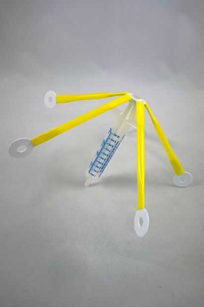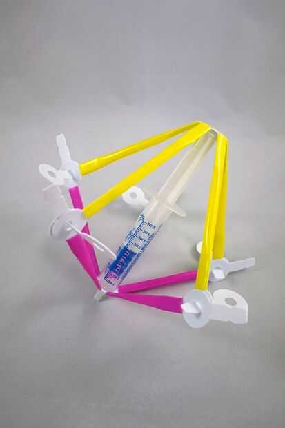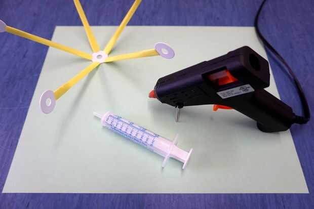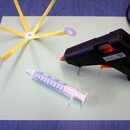 Usando una pistola de pegamento caliente, coloque el medio 5-Strawbee hasta el final del émbolo de una jeringa (este paso debe hacerse con supervisión de un adulto).