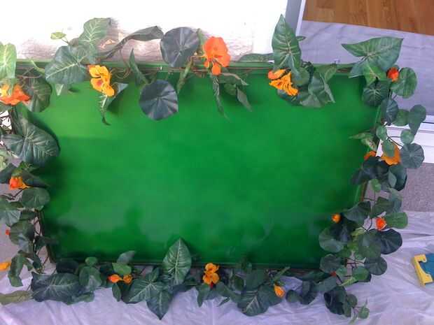 Tome la pistola grapadora y coloque la flor artificial / planta de decoración en el marco de madera de la bord.