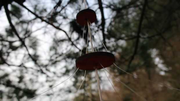 Utilice un alambre grueso para la parte media. Esto cuelga del árbol. Para las hojas se utiliza hilo de pescar (sobre 1,5 metros x 5). Poner el canal de cable de pesca los agujeritos y reunirlos en la pequeña ronda anterior.