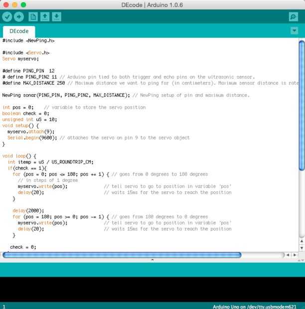 Delay(2000); para (pos = 180; pos > = 0; pos-= 1) {/ / va de 180 grados a 0 grados myservo.write(pos); / / enviar a servo a la posición en la variable 'pos' delay(20); / / espera 15ms para el servo a la posición} verificar = 0; } delay(250); Nos = sonar.ping(); Serial.Print ("Ping:"); Serial.Print(US / US_ROUNDTRIP_CM); Convertir el tiempo de ping de distancia e imprimir el resultado (0 = distancia fija exterior gama, no echo ping) Serial.println("cm"); Serial.Print(check); int i = uS / US_ROUNDTRIP_CM; Serial.Print ("movimiento de prueba"); Serial.println(i); Serial.Print(itemp); Si (< 125 & & i > 70 & & i! = 0) {comprobar = 1;}}