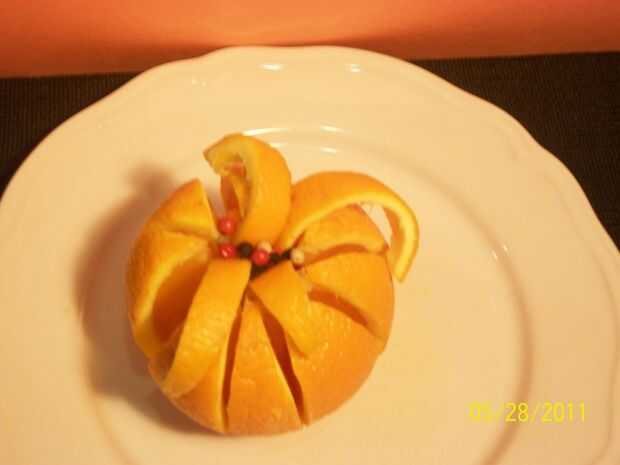 este es un simple, pero elegante, naranja hice como centro de mesa decorativo. Simplemente cortar la naranja en secciones, pero no cortar hasta el fondo. Luego curl tiras de cáscara de naranja y decorar. En mi foto, pongo las cáscaras alrededor de la placa y salir de la naranja. Además, pongo algunas pimientas variadas en el centro como toque final. ¡ Disfrute!