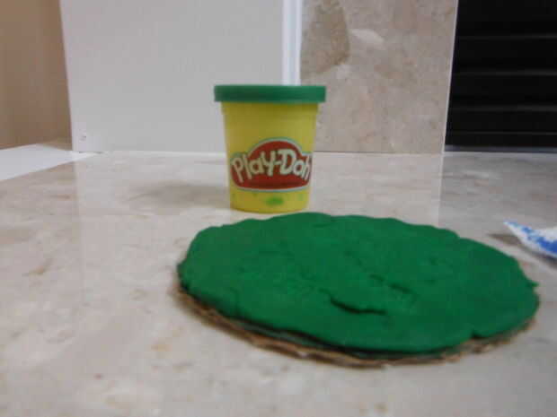 Coloque la plastilina en la parte superior del círculo de cartón y alisar uniformemente sobre la pieza de cartón. Libra la plastilina con las manos para quitar cualquier baches y grietas en la arcilla. El color de la plastilina será en la base y el fondo de la flor pistacho.