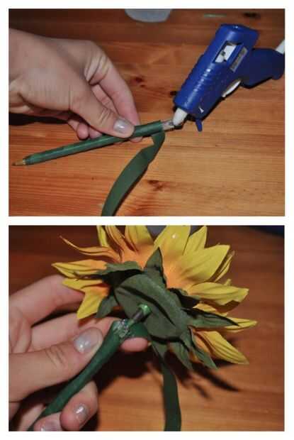 Tomar la pistola de pegamento caliente y apriete poco de pegamento en la parte superior de la pluma. Tomar tu flor y presione en la parte superior de la pluma. Una vez que la flor es en forma segura, continuar rodando la cinta hasta que esté en la base de la flor. Rasgar la cinta y alíselo para asegurarse de que se pega.