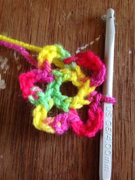 • Ahora continuar la puntada de cadena 5 veces y cierre en el centro de tu flor. • Continuar esto hasta tener 5 pétalos. (Por favor siga las fotos de arriba si no son conscientes de cómo hacer este paso)