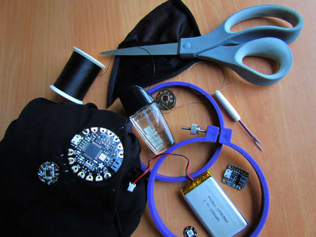 Mientras prueba de todo y enviar código a su Flora, puede tenerlo por conectarlo al ordenador, pero una vez que haya terminado que necesita poder realmente llevar la camisa fuera de. Esta batería ayuda a hacer tu camisa fácilmente usable.