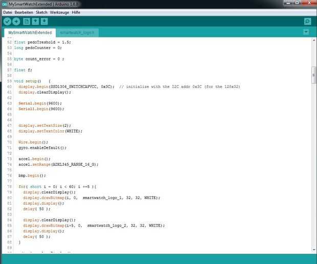 void loop() { int mydelay = 100; // get current milli seconds long mimi_start = millis(); long v = 0; bt_settings(); // check bluetooth queue clockTick(); // update periodontally if( counter == 0){ // update these function every second switch( show_screen ){ case CLOCK : renderClock(); break; case TEMP : show_temp(); break; case ACCEL : show_accel(); break; case GYRO : show_gyro(); break; } } // this function will be updated more often if( show_screen == PEDO ){ show_pedo(); } // the game will also be more often be updated if( show_screen == GAME1 ){ play_game_1(); } v = millis() - mimi_start; // dynamical delay calculation // wait const. 100 micro seconds // millis() will be reset after 50 days ! so we will get a delay if( v < 0 ){ mydelay = 100; } else if( v > 100 ){ mydelay = 0; count_error += v - 100; while( count_error > 100 ){ count_error -= 100; counter++; } } else{ mydelay = 100-v; } delay(mydelay); counter++; } De hecho eso es todo.