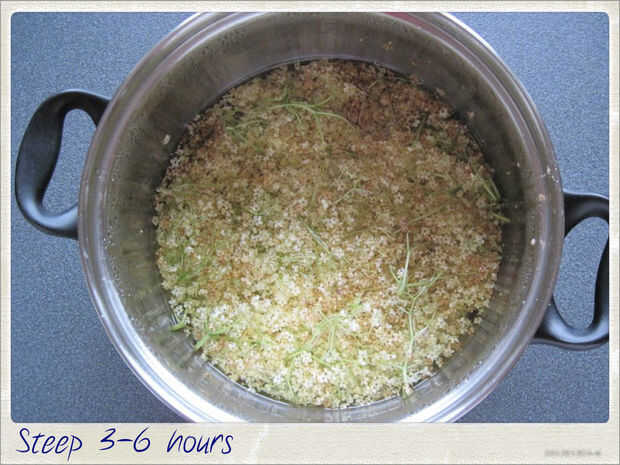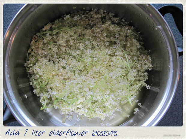 Tome la jarra de jarabe fuera. Lave los elderflowers en un recipiente de agua y clip de tanto los tallos como sea posible. Debe tener acerca de flores de saúco 1 litro. Sumerja las flores en el jarabe caliente. Ahora, puede tomar el bote en el interior, como no olerán las flores sumergidas.