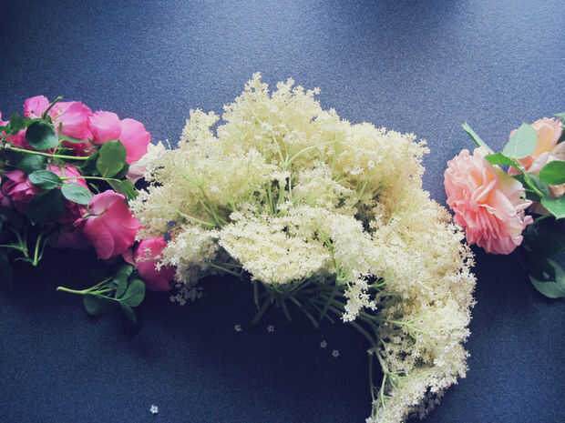Para el jarabe de flor de saúco, necesita de 10 flores de saúco. Le aconsejo mantenerlos fuera. Minutos después de que llevé dentro, tenía toda la casa corriendo para ver si era el perro o el gato, que se había hecho pis. Resulta que el olor provenía de los elderflowers. Quizá es una combinación del olor de la savia de la rama y las flores, las flores ellos mismos ni olor ni sabor como eso!