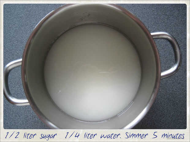 Así que para hacer el jarabe de flor de saúco, combine 1/2 litro azúcar (aproximadamente 1/2 kg.) y 1/4 de litro de agua. Cocinar a fuego lento durante 5 minutos.