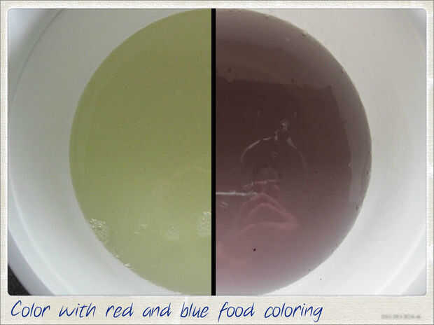 Elegí color mi jarabe un morado tenue con 5 gotas de rojo gel colorante y 2 gotas de azul. Mezclar el colorante en un recipiente y añadir un par de cucharadas del jarabe. Esto hará más fácil ajustar el matiz sin arruinar toda la masa de jarabe. Además, el color diluido hará más fácil agregar apenas la cantidad correcta a la porción más grande de jarabe.