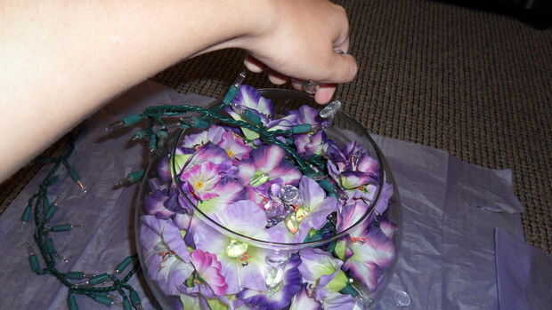 9A: colocar el pie siguiente de la cadena de las luces en el recipiente encima de la segunda capa de flores, granos y luces. Asegúrese de que dejar suficiente de la cadena fuera de la vasija por lo que fácilmente puede enchufarlo en una toma de corriente donde quieras. No utilice como mucho una sección de luces como lo hizo la segunda vez; la parte superior del tazón de fuente es la parte más pequeña. Como lo hizo con la primera capa, arreglar las luces así que son en un círculo alrededor del interior del recipiente. No desea que el cable o las luces visibles desde la parte superior de la lámpara.