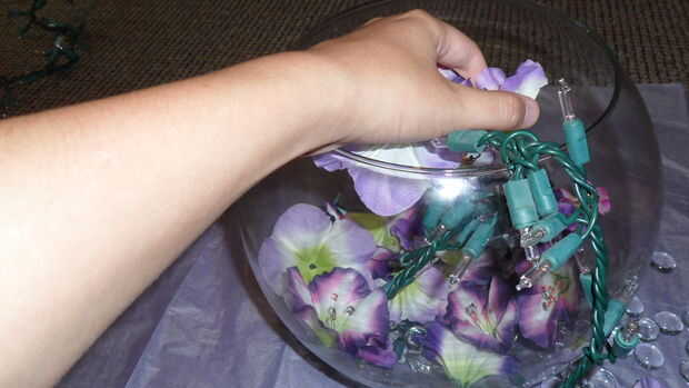 Flores espolvorear sobre las luces y bolas de cristal. Puede usar tantos como quieras; Normalmente utilizo un par de puñados, o lo suficiente como para cubrir el cable de las luces.