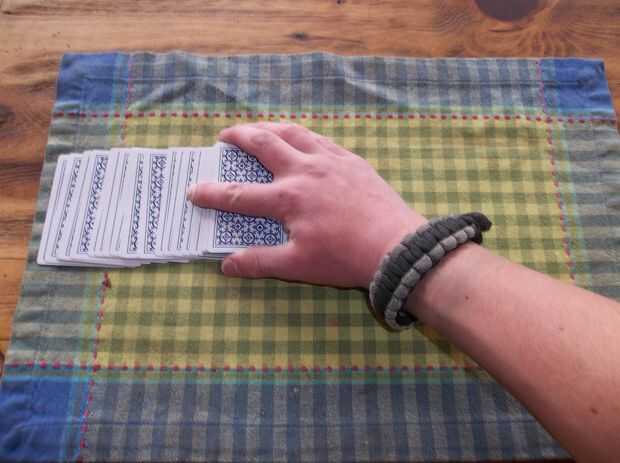 Arrastrar hacia fuera de la cubierta, coloque la cubierta en el lado izquierdo de la tabla o tela o lo que sea, y aplique presión hacia abajo al mover la cubierta todo a la derecha. Utilice el dedo índice para controlar cuántas cartas salen.
