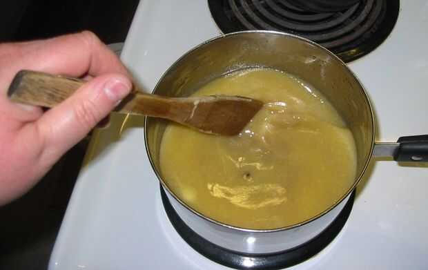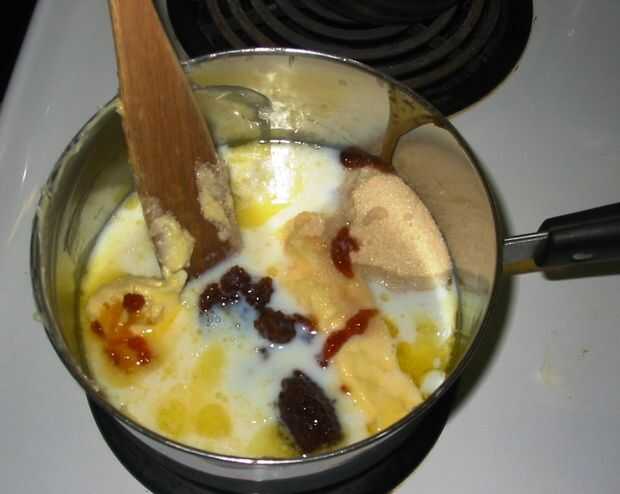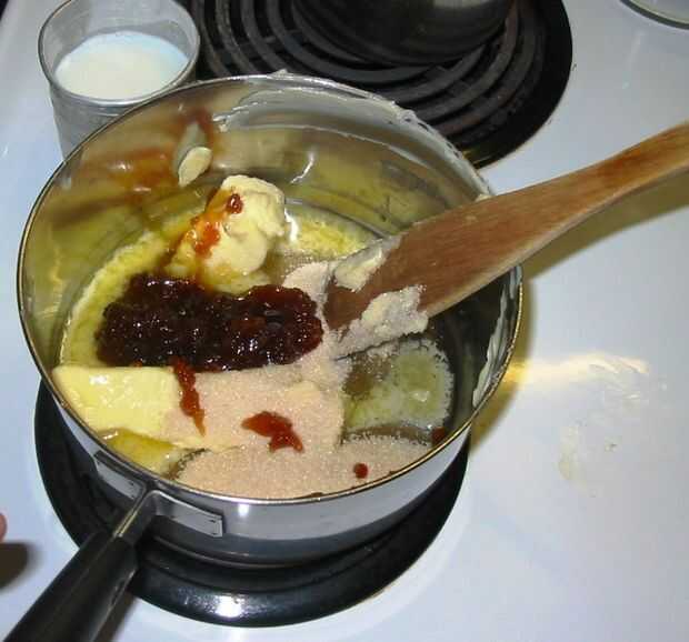 En una cacerola mediana poner la mantequilla, la leche, el azúcar, y miel para un roiling hervir revolviendo ocasionalmente.
