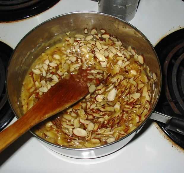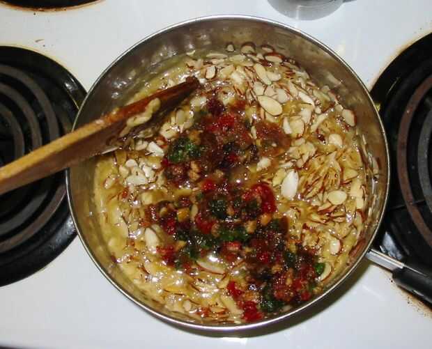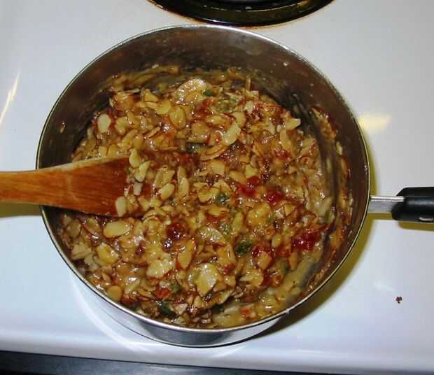 Retirar del fuego y agregue las almendras, harina y fruta confitada.