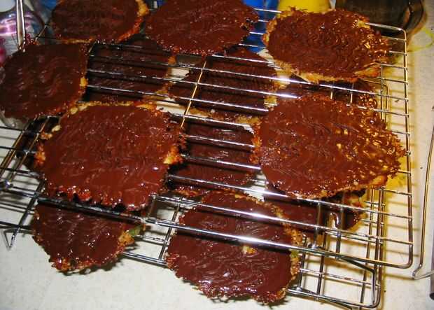 Ahora que las galletas estén frías, retirar de la parrilla cuidadosamente y vuelta. En los fondos extensión el chocolate por toda la galleta. Mantenerlos boca abajo hasta que esté firme. Si quieres ser un poco fantasia puede tomar un tenedor y remolino sobre antes de que el chocolate esté firme. Hacer cualquier diseño que te gusta. En las fotos puede ver he intentado, pero el chocolate era a suave. La segunda foto de las galletas en la rejilla muestra cierto patrón. Después sobre el 3 º o 4 º intento me di por vencido. A mis hijos y yo comiendo y no importa mucho para la imaginación. JAJAJA!
