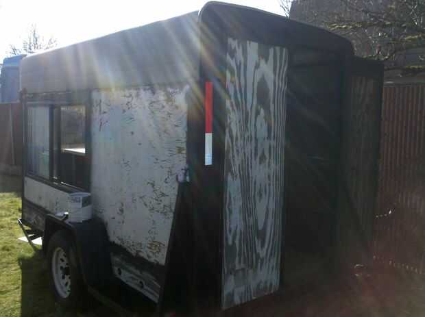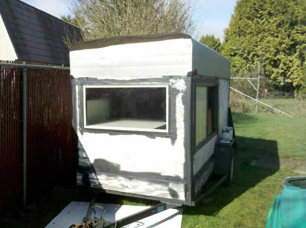 Había dos agujeros grandes en la parte delantera del remolque. Eran probablemente unos 1.5-2" alrededor y spackle normal no funcionaría para éstos. De la madera contrachapada arrancó en el interior del remolque y de la mejor manera para cubrir los agujeros y mantenga nivelado con la madera contrachapada es usar palitos para cubrirlo. Luego aplica el compuesto de juntas sobre ambos lados de la misma antes de pintar y enarenó. Consulte el gráfico para más detalles.