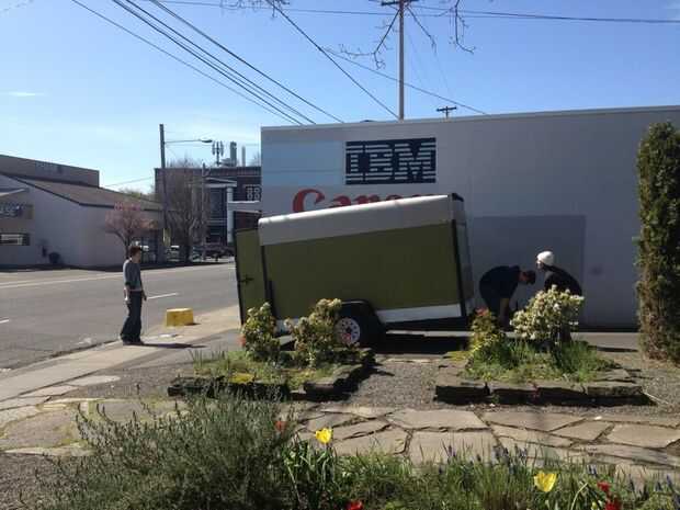 El trailer fue terminado y listo para moverse al lugar. Engancha hasta su jeep y había remolcado sobre. Fue lo suficientemente ligero (pesado todavía) me coge el gancho de remolque y maniobra en su lugar final. Una vez que configuramos los estantes y las flores agregadas, usted podría reconocer apenas el carro ya.
