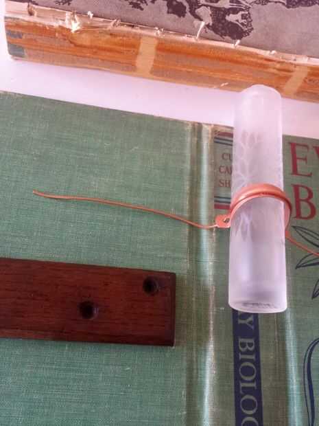 Forma de la abrazadera a la botella. En esta etapa he añadido cable pero también podría unir la botella directamente a la cubierta del libro en este momento. Pequeños clavos de cobre (o tornillos) serían un gran trabajo!