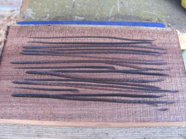 Iniciado por hacer muchos cortes pequeños y luego más profunda en algunos tramos. Seguí al azar por lo que no había patrones y un montón de variedad de profundidad. Para obtener la profundidad sólo aplica más presión y utiliza movimientos repetitivos.