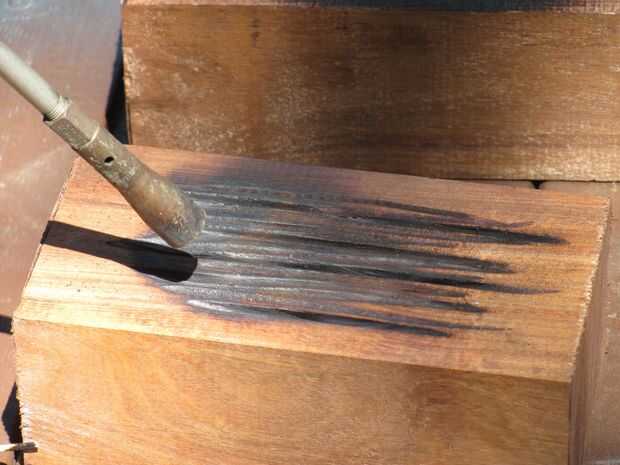 Para ello he usado un soplete de butano. Esta quemado las áreas perdidas por el aparato. La carbonización se suma a la textura que se agregó con el cepillo de alambre y rasgón hacia fuera.