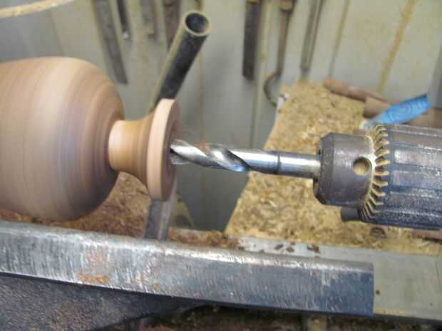 11. Perfore el centro con una broca. Tengo un largo 12,5 mm poco que puse en el chuck de jacobs que se conecta a mi acción de la cola podría enrollarla en. Esto podría hacerse por un taladro si no tienes un jacobs chuck para torno. (foto 12)