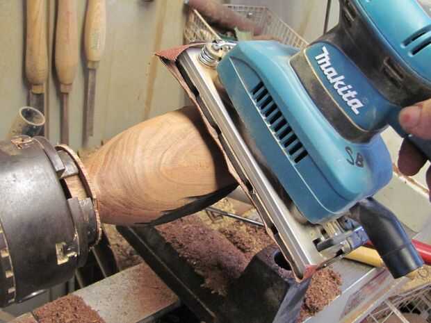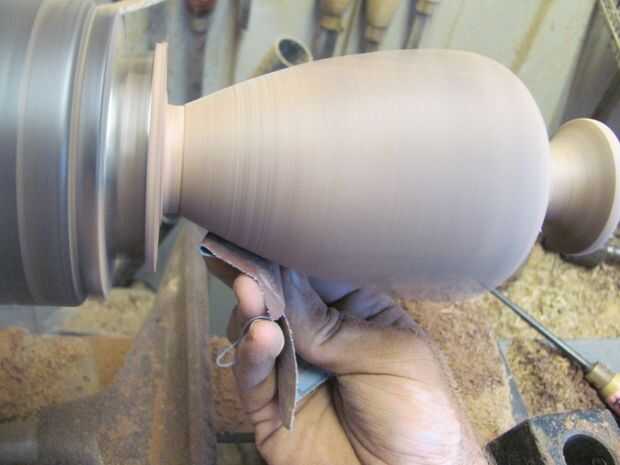 Me pareció mejor que la sección del medio con una lijadora de arena con el torno apagado para reducir el golpeteo y redondeo sobre eso lijado con el torno funcionando. Lijar el resto de la vasija como normal, progresando mi camino aunque los granos, teniendo la arena papel corriendo con la dirección de su giro