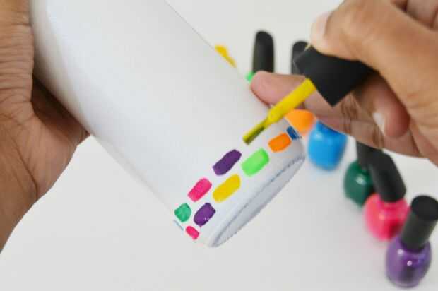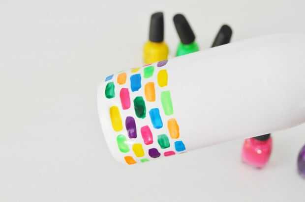 Decidí añadir efecto de mosaico en el fondo de la botella y oro pintura para la parte superior. Para conseguir este efecto, Simple pintar un trazo con el esmalte de uñas pincel y repetir lo mismo con todos los colores.