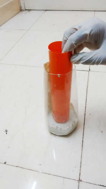 Vierta una pequeña cantidad de cemento y colocar en el cilindro de plástico, asegúrese de que su centrado. Luego agregar el cemento restante alrededor del cilindro. No vierta cualquier cemento dentro del cilindro.