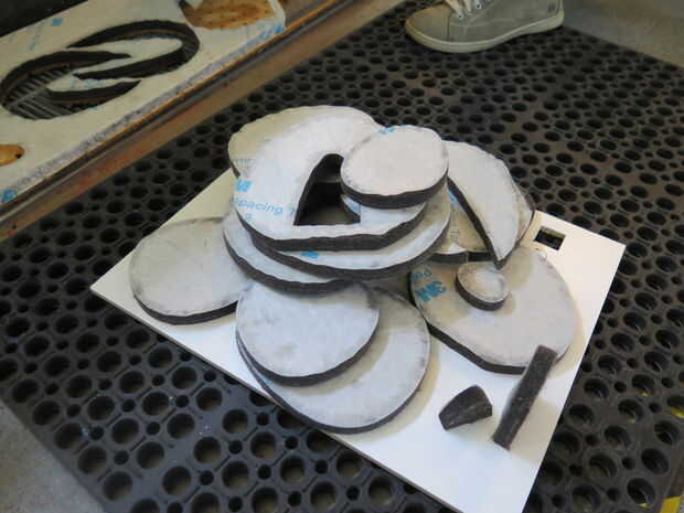 Había quitado el frisket, así que tuvo que referirse a una copia impresa de la hoja de corte de la ruta (mostrada arriba) para conseguir mi parte derecha y en el orden correcto y todo alineado por cuidadosamente, echando un vistazo la pila desde todos los ángulos. Si crea los agujeros de alineación en sus piezas en 123D hacen, puede utilizar un par de pequeñas espigas o barras de metal para ayudar a hacer esto.