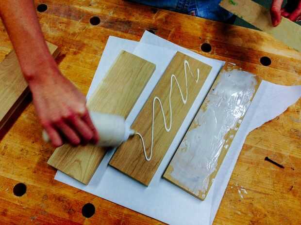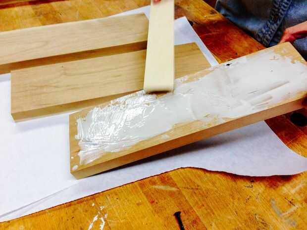 Para hacer una base más gruesa, unir las piezas de madera. Use pegamento para madera y un trozo de madera para extender la cola uniformemente a lo largo de la superficie. Un truco interesante que aplicar pegamento a sólo tres de las cuatro piezas después de decidir que pieza te gustaría tener en la parte superior.