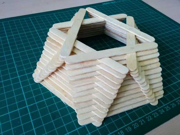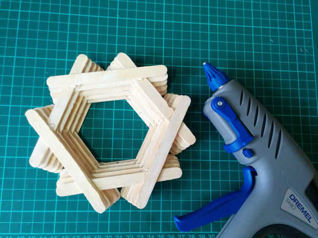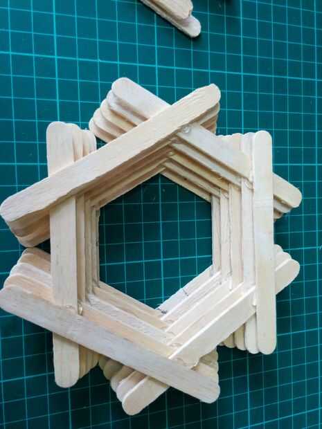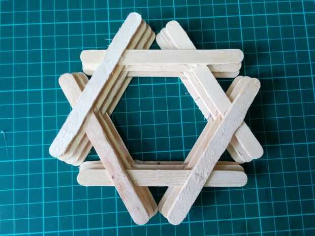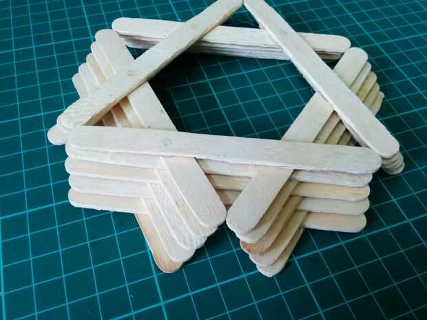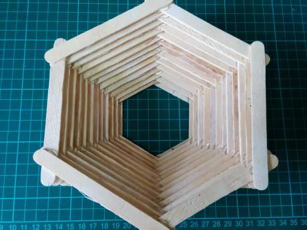 Siga los mismos pasos hasta llegar a las 12 capas. En cada nivel tienes que hacer un triángulo. Como proceder para las capas más altas y mayor el tamaño del triángulo se aumenta gradualmente. Cuando se mueve hacia el exterior debe tener cuidado al hacer la misma cantidad de movimiento hacia afuera en cada capa. Esto hará que la estructura más simétrica. Al llegar a la capa 12 la parte inferior de la lámpara de la cesta es completa.