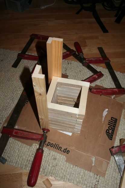 Poner pequeños trozos de papel de la hornada en los puntos de pegamento, para que las capas se pone encima de la otra no pegan. Hacer tres o cuatro capas más y ponerlos uno encima del otro (de modo que formen una torre recta). Ahora poner los soportes en las cuatro esquinas de su pequeña torre y sujetarlos suavemente junto con cuatro abrazaderas. Seguir añadiendo capas hasta el final de sus soportes (siempre cuidado, que las capas son agradables y plano en la parte superior).