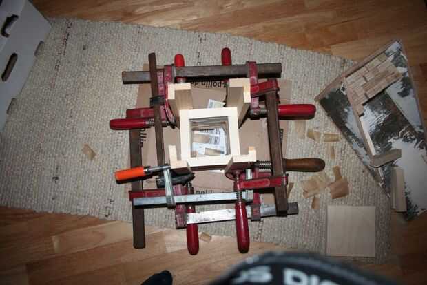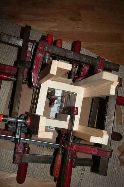 Ahora añadir otro cuatro abrazaderas en la parte superior y sujete todo juntas. Tienes que apretar las mordazas igualmente, o sus marcos podrían empezar a mover y se convierten en aristas. Es mejor añadir unas pinzas más en medio de los soportes para fuerza extra.