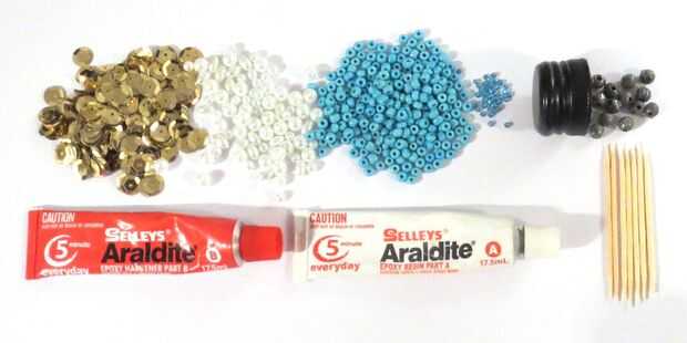 Azul de lentejuelas, perlas, perlas (mi tienda de artesanía local no tenía ningún canutillos gold :()