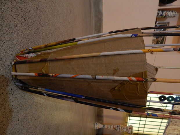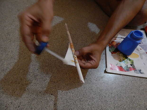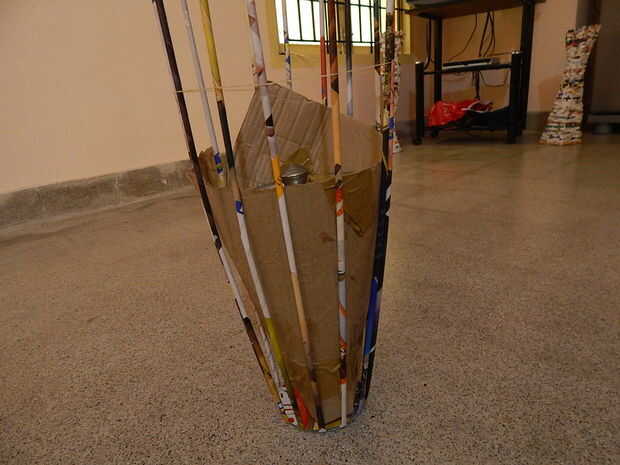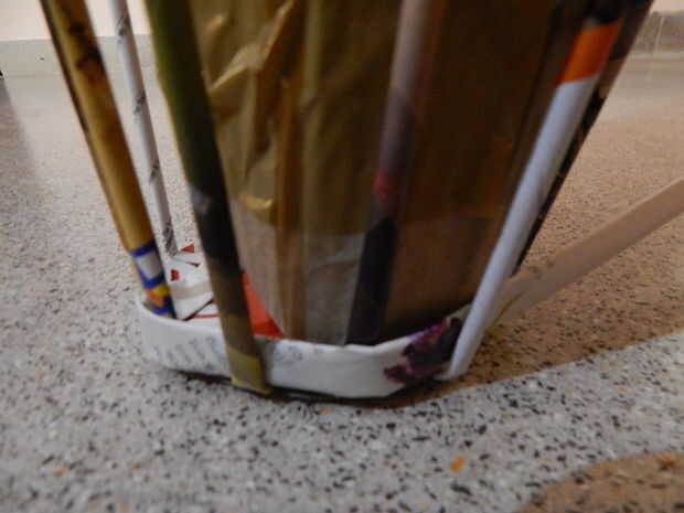 • Tomar el esqueleto de la vasija y doblar hacia arriba los pilares. Mantenga algunos cono en forma de estructura dentro del esqueleto y el pilar se pega en la parte superior del lazo. Esto es para mantenerse en forma mientras los rollos de papel de la bobina. He hecho una tabla de paquete fino en un cono y con cinta en el extremo