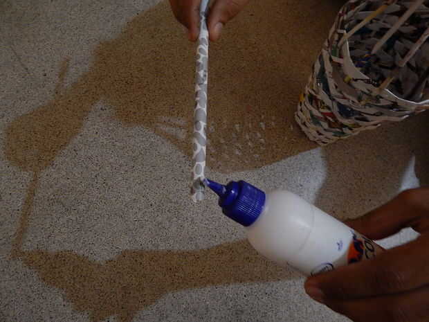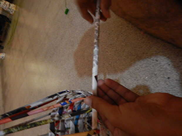1 pliegue longitudinal 10 a 20 hojas de papel revista2 tejer uno a través de otra (con cinta adhesiva hacia abajo para no volar para arriba)3 una vez haya terminado de tejer voltear a otro lado y la cinta hacia abajo y doblar los extremos.4 Si el emb