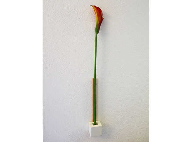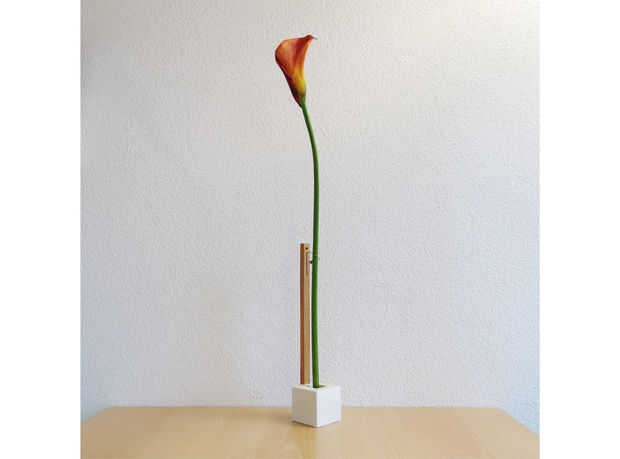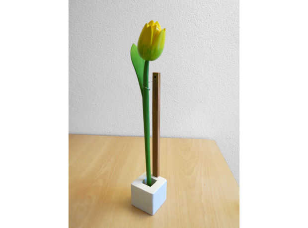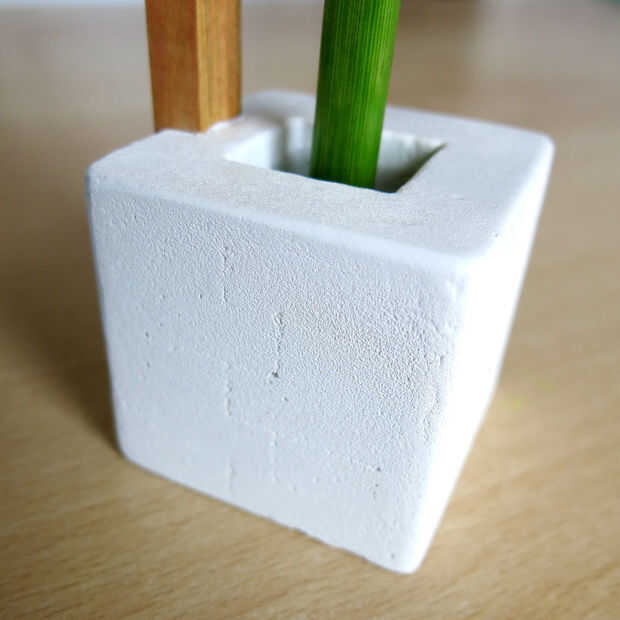 Este es un minimalista florero para una flor de altura, construido con hormigón y madera.